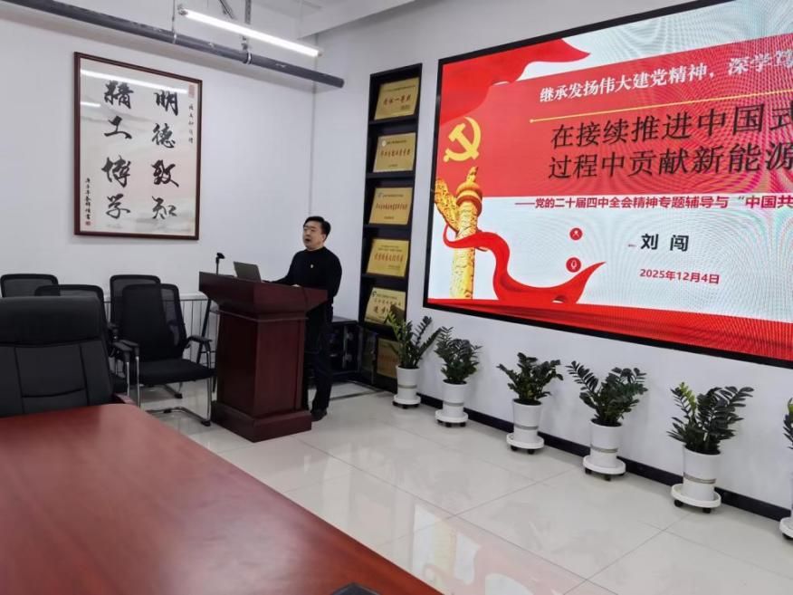 12月4日,按照学校党委统一部署,新能源学院召开全体党员大会,专题开展党的二十届四中全会精神辅导与“中国共产党人精神谱系”宣讲活动活动。学院党总支书记刘闯以《继承发扬伟大建党精神,深学笃行四中全会精神,在接续推进中国式现代化过程中贡献新能源人力量》为题作宣讲报告,全体师生党员参加,共同学习领会全会精神的核心要义与实践要求。